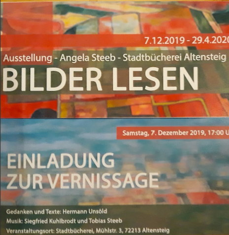 | Januar 2019 | Hier findest du meinen Instagram Kanal: www.instagram.com/angela54_mm/ | Dezember 2019 | Vernissage "Bilder lesen" am 07.12.2019 um 17 Uhr in der Stadtbücherei 72213 Altensteig "Einladung zur Vernissage" | Mai 2018 | Gemäldeausstellung im Museumshof Kammern in Steiermark in Österreich. Beginn: Montag, den 21.5.2018 um 17 Uhr. Die Künstlerin wird die Vernissage gemeinsam mit ihrem Mann Tobias Steeb auch musikalisch umrahmen. Bilder der Austellung |