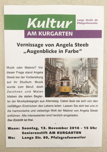 | November 2016 | Vernissage "Augenblicke in Farbe" am 13.11.2016 um 15 Uhr im Seniorenstift AM KURGARTEN in 72285 Pfalzgrafenweiler "Einladung zur Vernissage" |